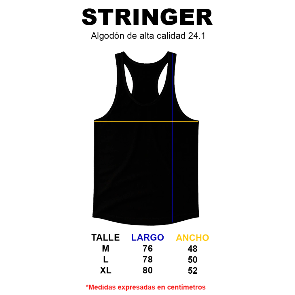 - Musculosa corte Stringer 100% algodón con logo en serigrafía. - Lavado con jabón neutro y agua fría. - A la hora del lavado se recomienda colocar la prenda al revés para proteger el diseño.